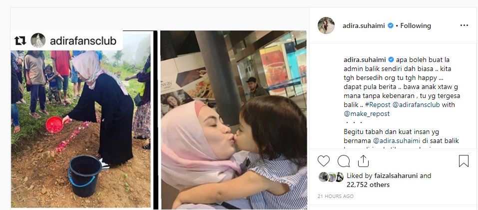 “Min tau @adira.suhaimi seorang wanita yg kental. Kami AFC sayang dan sentiasa menyokong dari belakang,” tulisnya.