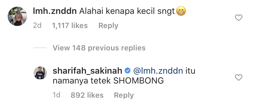 Walaubagaimanapun, Sakinah atau nama sebenarnya Sharifah Nurul Sakinah Syed Abu Bakar Al-Khaired tidak mendiamkan diri dan membalas salah satu komen.
