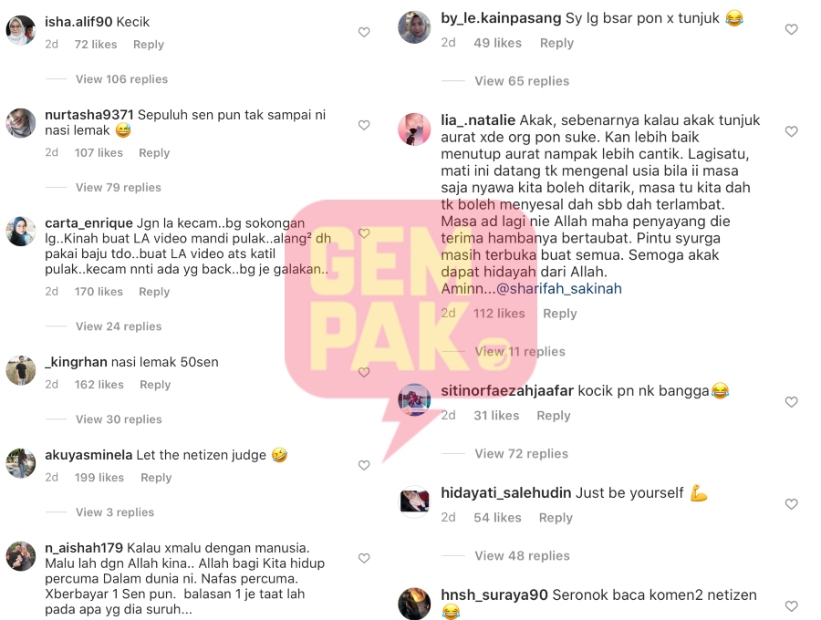Terdahulu, Sakinah menerima kecaman hebat daripada pengikut selepas memuat naik foto melakukan pose dengan menayangkan bahagian dada.
