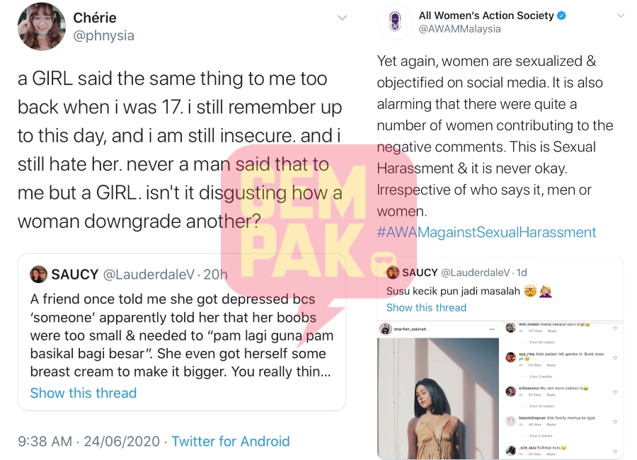 Malah, gadis ini turut mendedahkan terdapat rakannya yang mengalami depresi disebabkan body shamming.Susu kecik pun jadi masalah ???♀️ pic.twitter.com/gmsN1bIkC3