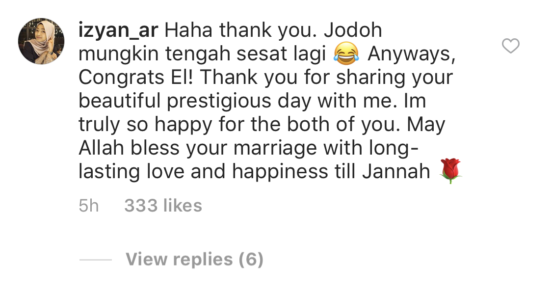 "Thank you for coming to my wedding. May Allah repay your kindness & semoga dipercepatkan jodoh jugak. Thanks Izyan," tulis Elfira.