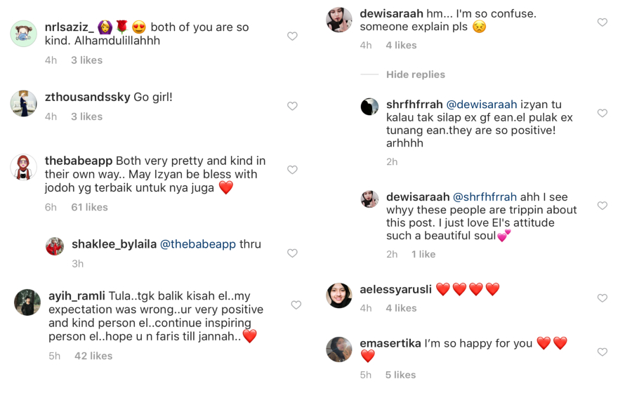 Rata-rata peminat memberikan komen positif kepada Izyan dan Elfira serta turut mendoakan agar Izyan dikurniakan jodoh yang baik.