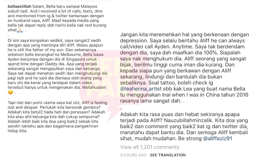 "Bella sangat sedih untuk tengok apa yang jadi kepada Aliff. Sebabnya, kita tak akan tahu... Kita ke, keturunan kita ke, atau kawan-kawan dekat kita, boleh jadi benda yang sama.