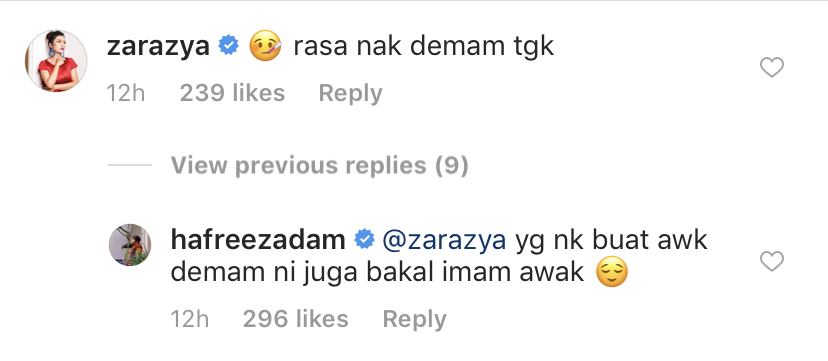 Pelakon Zara Zya yang merupakan kekasihnya turut meninggalkan komen di ruangan entri tersebut.
