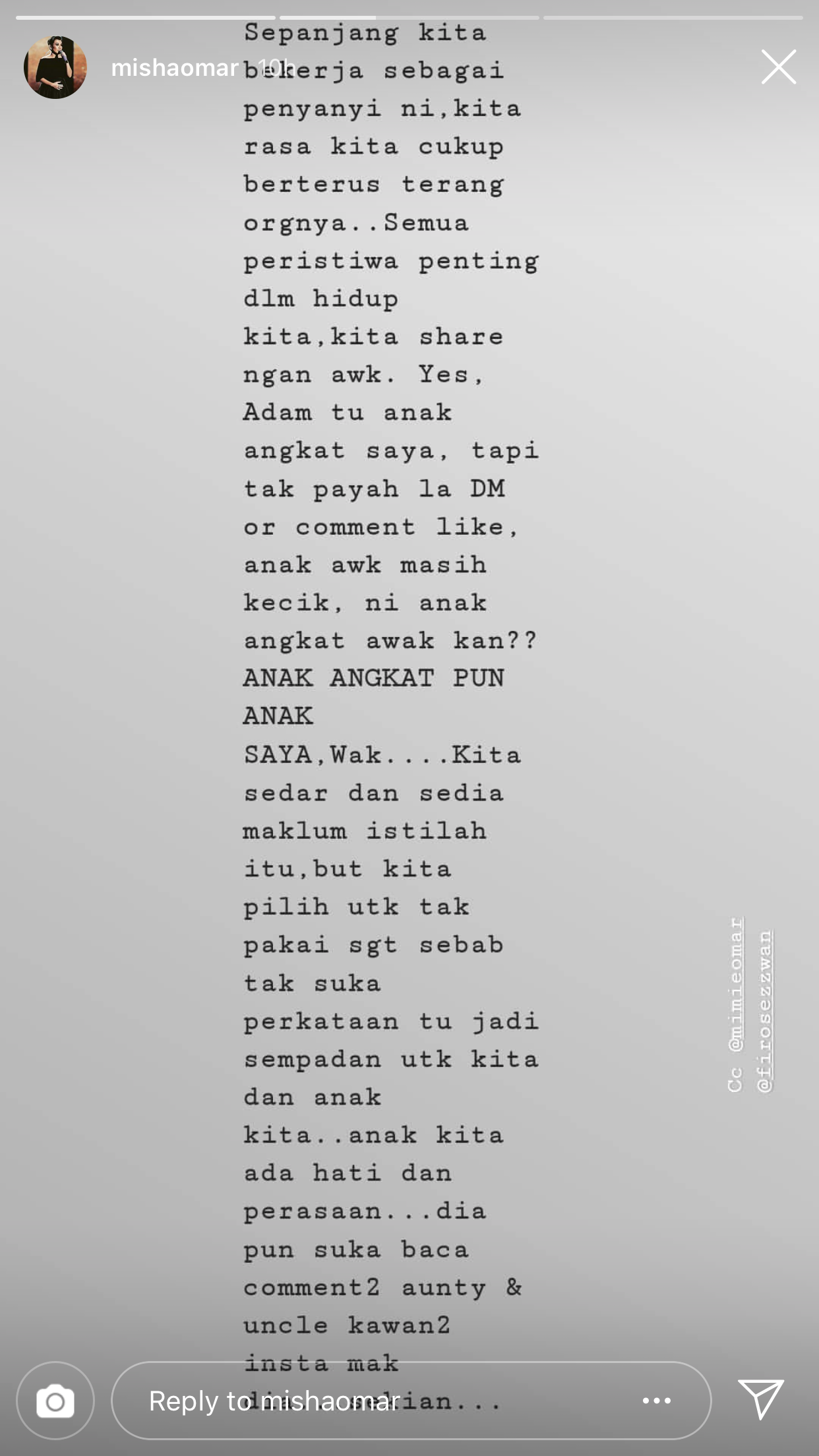 Menerusi entri di Insta Story miliknya, Misha memberitahu dia tidak gemar istilah ‘anak angkat’ ditujukan kepada Adam.