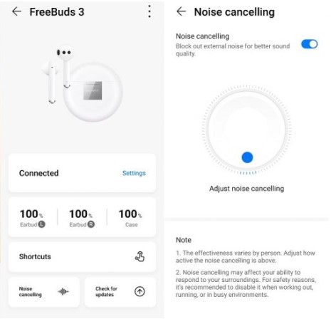 Dalam applikasi ‘Smart Life’, anda juga boleh menetapkan double-click untuk earfon kiri atau kanan dan juga fungsi play, pause, dan active voice assistant atau hidupkan/matikan pembatalan bunyi aktif. Apabila anda menyambungkan HUAWEI FreeBuds 3 ke fon anda, anda juga boleh mengetahui kuasa baki pada earfon anda.