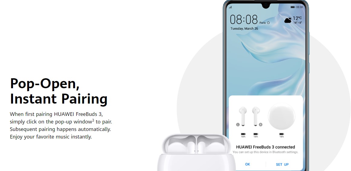 Setelah sambungan pertama HUAWEI FreeBuds 3 dengan HUAWEI Mate 30 Pro, setiap kali penutup kotak pengecasan dibuka, ia akan sambung dengan fon anda dengan automatik yang hanya mengunakan 3 saat sahaja.