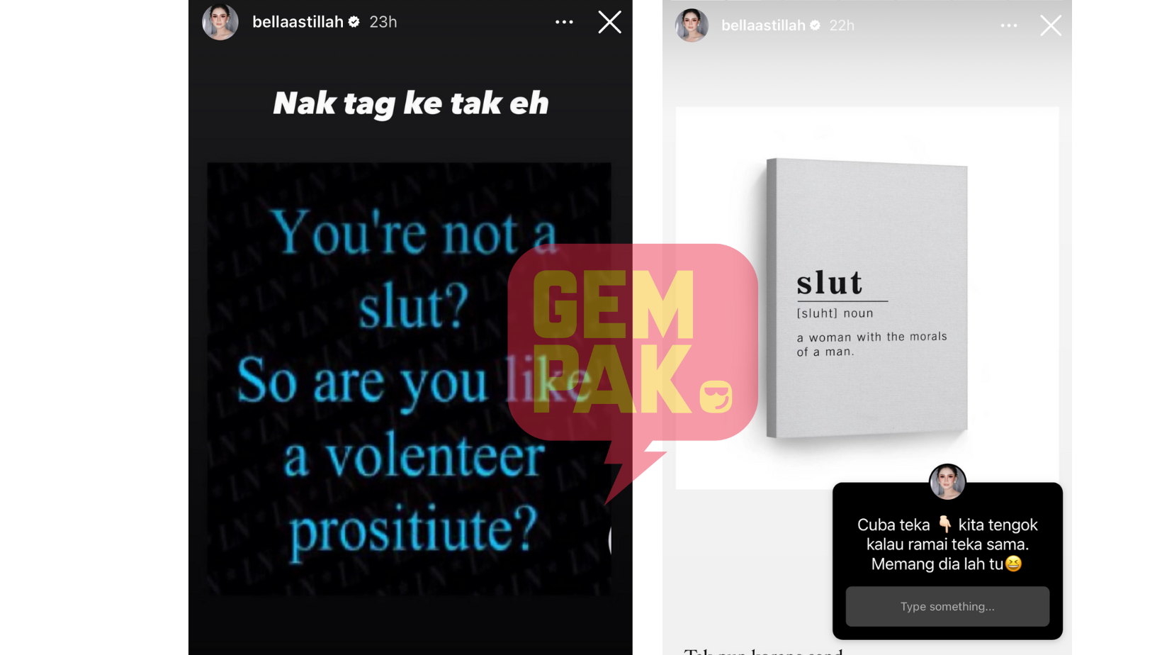 “Adakah awak sebenarnya ialah perempuan murahan? Jika ia, kamu tak ubah macam pelac*r,” tulis quotes berkenaan.