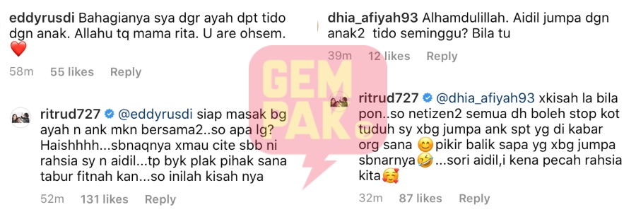 "Siap masak bagi ayah dan anak makan bersama-sama. Jadi apa lagi? Haishh sebenarnya tak mau cerita sebab ini rahsia saya dan Aidil. Tapi banyak pula pihak sana tabur fitnah kan. Jadi inilah kisah," kata Rita menerusi ruangan komen di Instagram (IG).