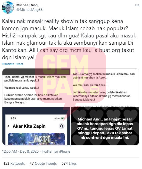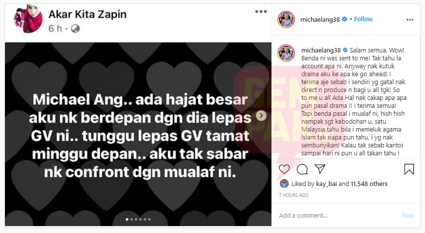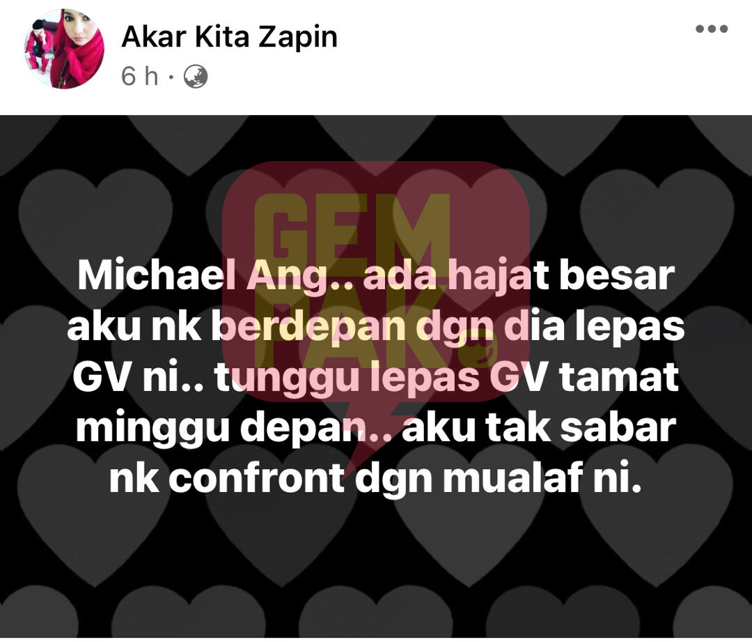 "Michael Ang... Ada hajat besar aku nak berdepan dengan dia lepas GV ni, tunggu lepas GV tamat minggu depan. Aku tak sabar nak confront dengan mualaf ni," tulis pengendali akaun itu.