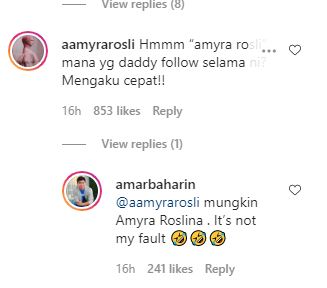 “Hmmm Amyra Rosli mana yang daddy follow selama ini? Mengaku cepat!,” tulis Amyra di ruangan komen.