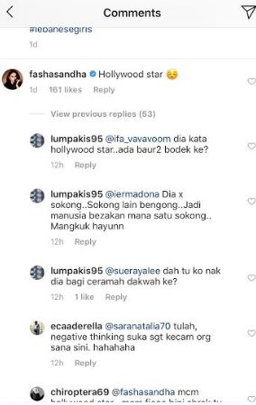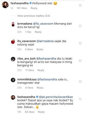 "Bodek? Apa yang saya dapat kalau bodek? Saya cuma maksudkan gaya macam Hollywood star, sekian." balas Fasha kepada seorang netizen.