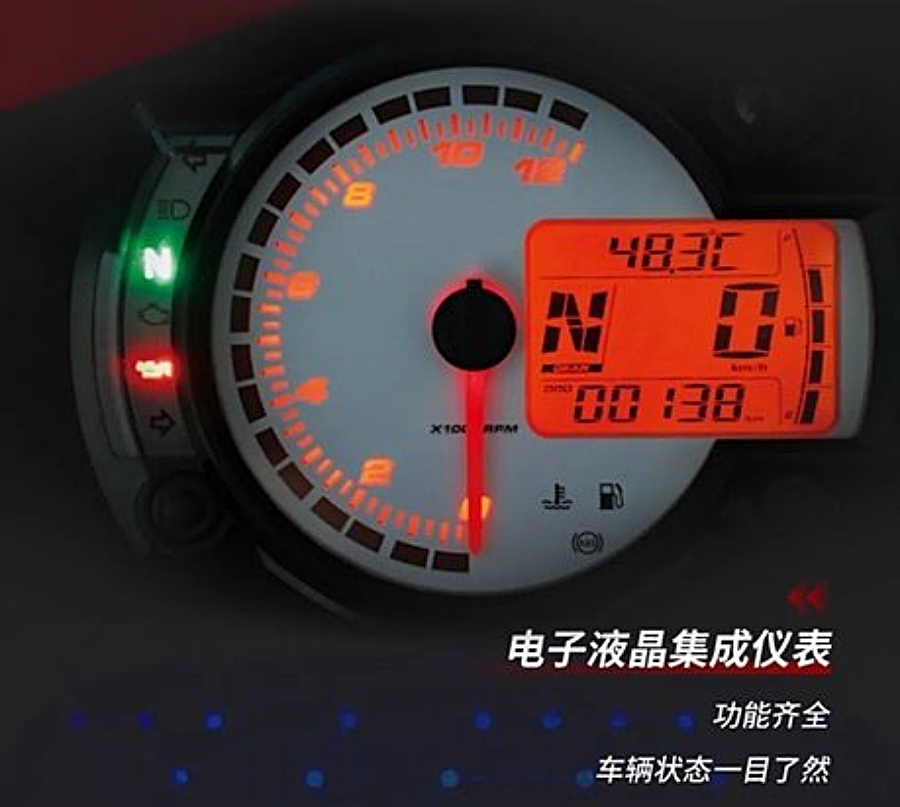 Takometer dipaparkan secara analog manakala skrin digital kecil mempamerkan maklumat seperti suhu enjin, kedudukan gear, odometer, spidometer serta baki minyak petrol.