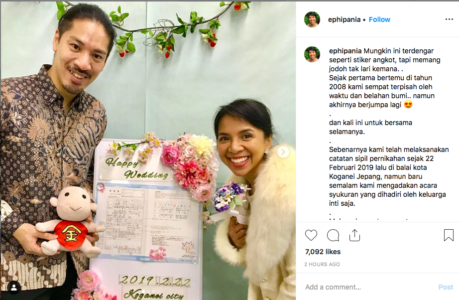 Lewat unggahan di akun Instagramnya, @ephipania sekitar dua jam lalu, Arina mengungkapkan mereka sebenarnya telah melaksanakan catatan sipil pernikahan sejak 22 Februari 2019 lalu di balai kota Koganei Jepang.