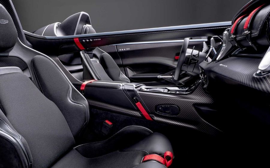 Bagi memastikan berat tidak berlebihan, badan kereta ini diperbuat menggunakan gentian karbon. Dalam kabin terbuka itu, ada pemisah antara pemandu dan penumpang depan. Aston Martin memanggilnya tulang belakang (spine).