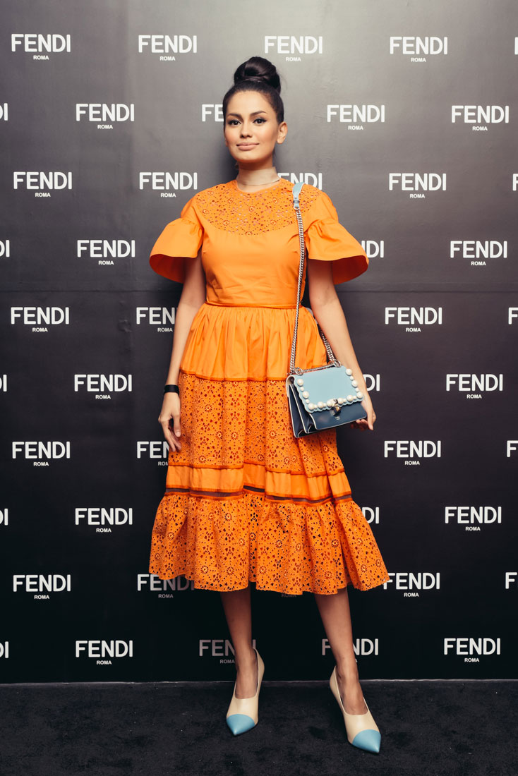 Jingga summer bertingkat tekap floral FYZA KADIR padu dengan pumps berpanel dua tona Fendi.