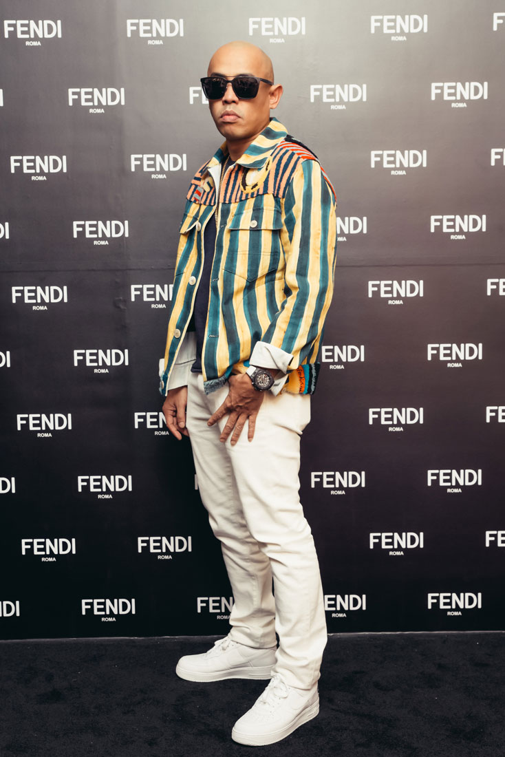JOE FLIZZOW turut meraikan pembukan semula butik Fendi dengan kemeja jalur berwarna terang.