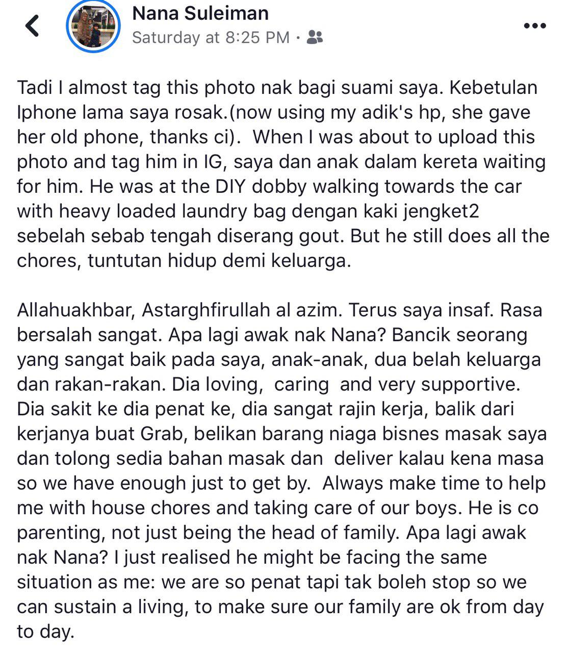 Allahuakhbar, Astarghfirullah al azim. Terus saya insaf. Rasa bersalah sangat. Apa lagi awak nak Nana? Bancik seorang yang sangat baik pada saya, anak-anak, dua belah keluarga dan rakan-rakan. Dia loving, caring and very supportive. Dia sakit ke dia penat ke, dia sangat rajin kerja, balik dari kerjanya buat Grab, belikan barang niaga bisnes masak saya dan tolong sedia bahan masak dan deliver kalau kena masa so we have enough just to get by. Always make time to help me with house chores and taking care of our boys. He is co parenting, not just being the head of family. Apa lagi awak nak Nana? I just realised he might be facing the same situation as me: we are so penat tapi tak boleh stop so we can sustain a living, to make sure our family are ok from day to day.