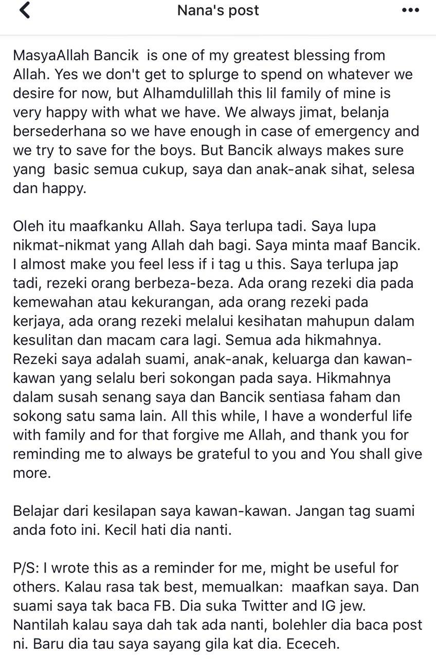 Seperti yang Dicoretkan Nana Suleiman di akaun Facebooknya..