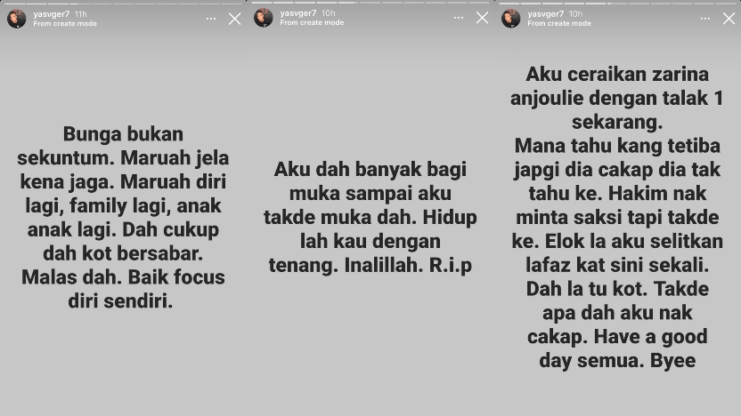 "Siapa yang cakap aku childish ka apa ka sebab asyik cerai. Dan sekarang aku tiba-tiba up (muat naik status di Instagram) macam ni. Sebelum ini ada aku buat benda terkutuk keji ini? Ada aku nak up?