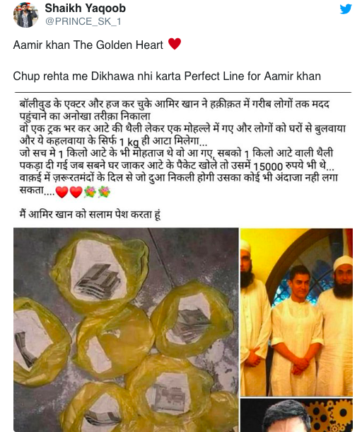 Ia menuliskan "Aamir khan The Golden Heart," tulis PRINCE_SK_1 sambil membagikan foto tepung berisikan uang dalam kantong plastik berwarna kuning.