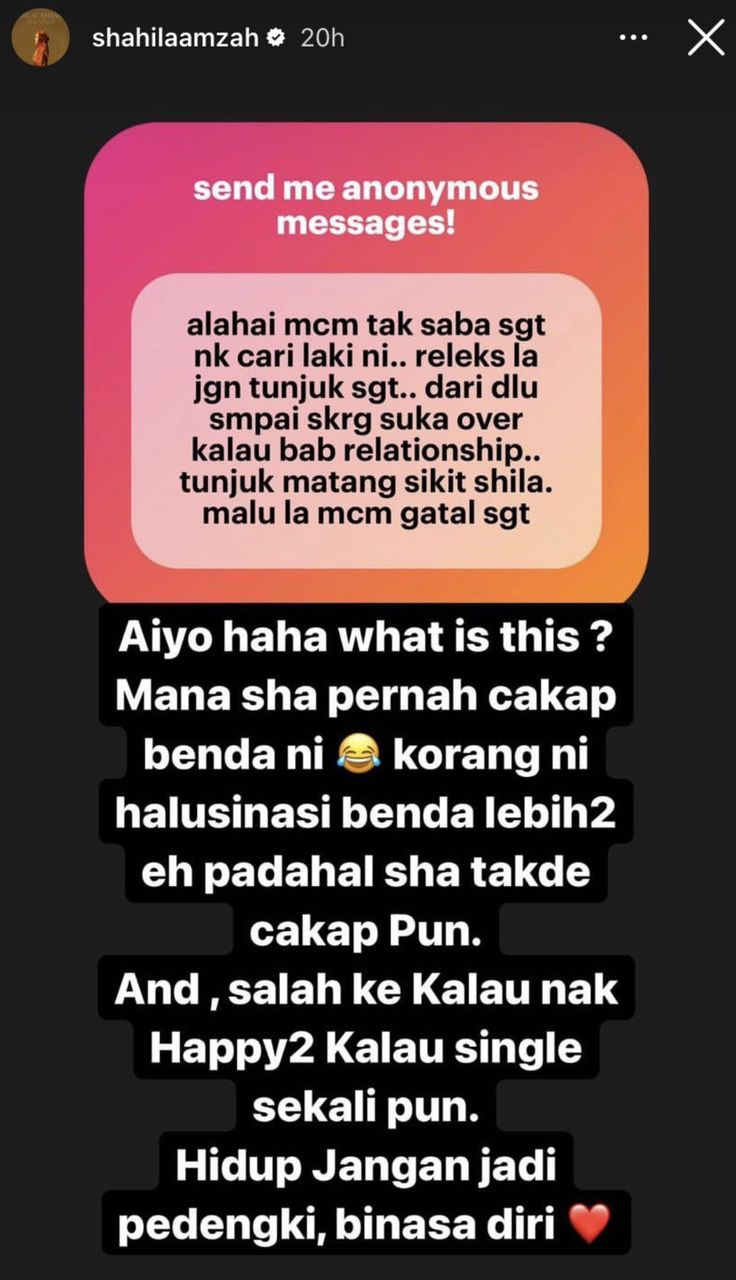 Terdahulu, Shila menerima kecaman netizen selepas menjawab beberapa soalan menerusi ruangan popular send me anonymous messages! di Instagram.