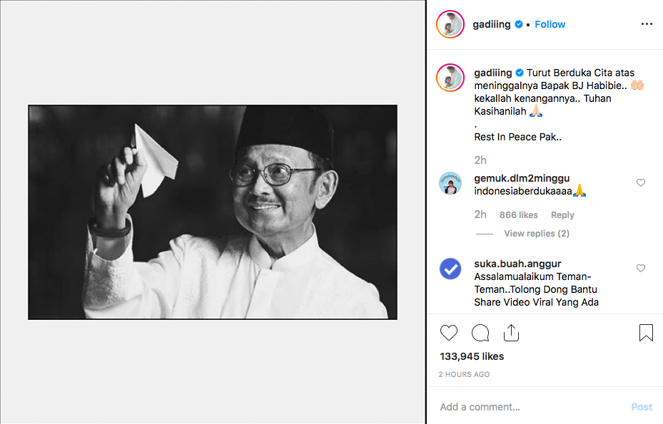 "Akan sangat merindukan Eyang Habibie. Beliau adalah sosok yang sangat sangat ramah. Sangat enerjik. Semangat dalam hatinya yang mendikte tubuhnya.
