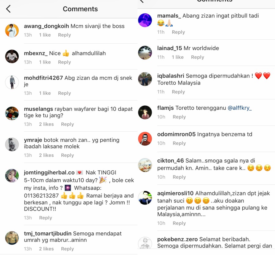 Rata-rata komen yang ditinggalkan di laman Instagram Zizan mendoakan agar jejaka itu dipermudahkan urusannya semasa mengerjakan ibadah.