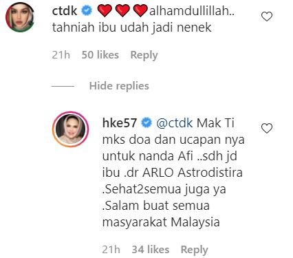 Dalam pada itu menerusi ruangan komen, penyanyi kesayangan negara iaitu Datuk Siti Nurhaliza juga tidak ketinggalan menyampaikan ucapan tahniah buat bunda sekeluarga.