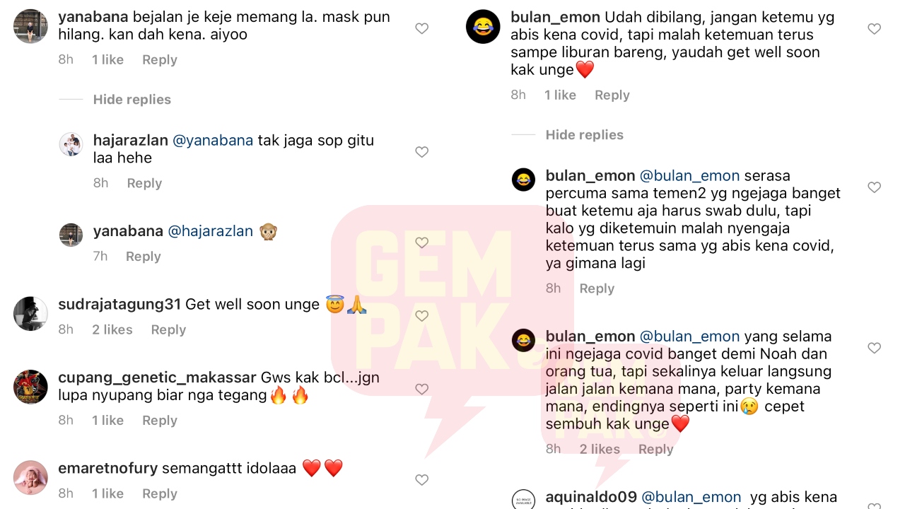 "Yang selama ini menjaga COVID-19 banget demi Noah dan orang tua, tapi sekalinya keluar langsung jalan-jalan kemana-mana, parti kemaa-mana, endingnya seperti ini," demikian antara komen lain yang ditulis pengguna di Instagram.