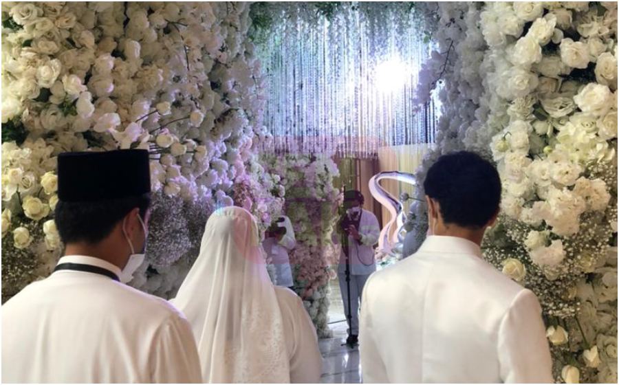 Ini termasuk poster walimatulurus dan kad yang diletakkan di atas meja tetamu di dewan nikah yang dihiasi indah dengan bunga segar putih.