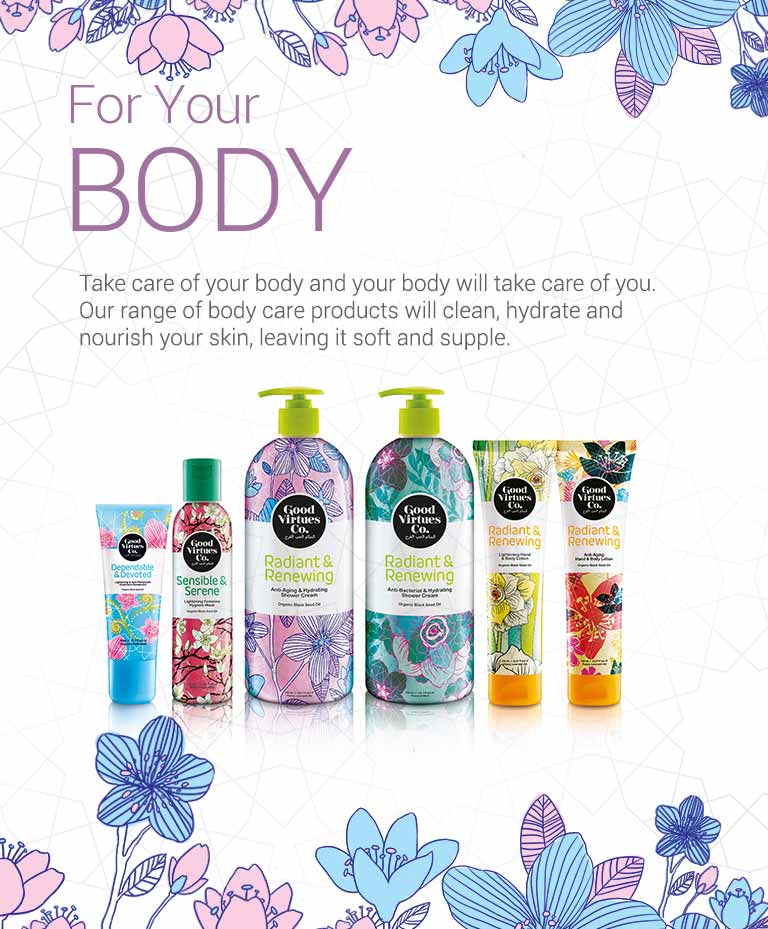 Bagi yang tercari-cari produk penjagaan kulit badan yang sesuai, Good Virtues Co. juga mempunyai krim mandian anti-bakteria dan anti-penuaan.Malah, produk losen anti-bakteria dan anti-penuaan turut diperkenalkan.