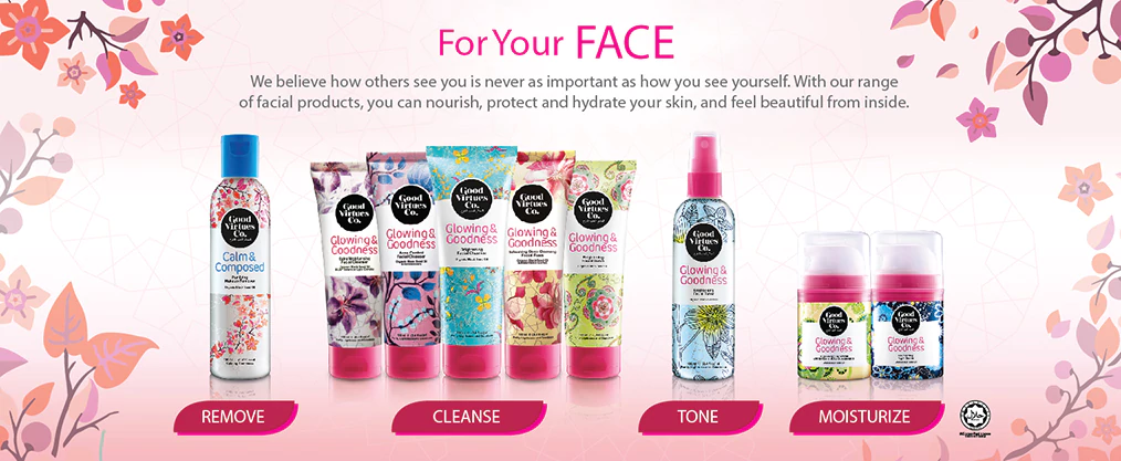 Bermula dengan set pembersih wajah, scrub, toner, krim harian dan malam hingga make up remover boleh didapati di Good Virtues Co.