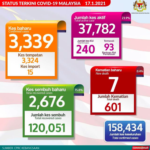 Sejumlah 3,339 kes baharu COVID-19 dilaporkan di negara ini dalam tempoh 24 jam lalu, menunjukkan penurunan berbanding semalam dengan catatan kes pecah rekod sebanyak 4, 029.