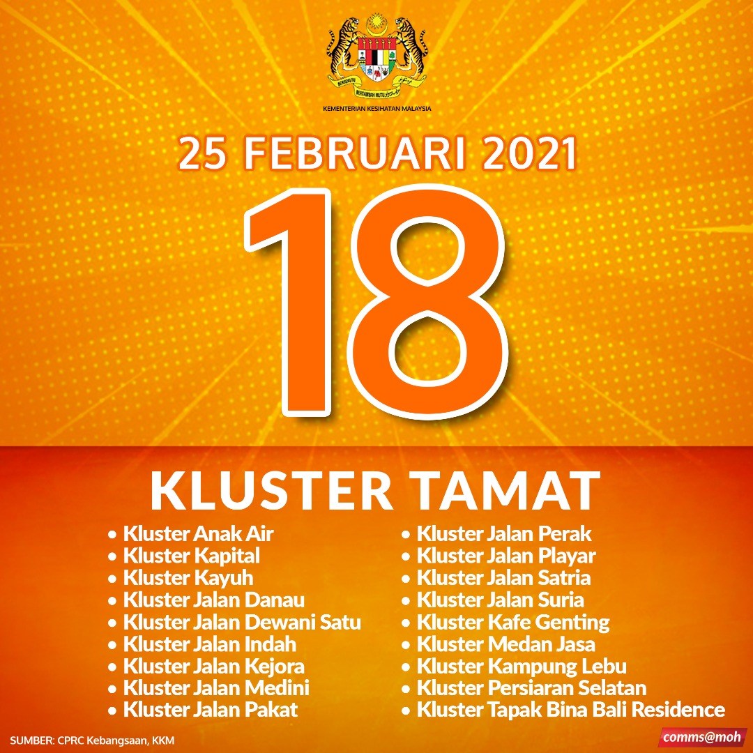 Dalam pada itu, menerusi akaun Facebook rasmi Kementerian Kesihatan Malaysia melaporkan sebanyak 18 kluster juga telah ditamatkan hari ini.