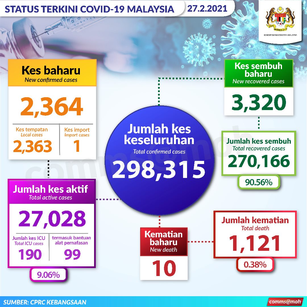 Sebanyak 2,364 kes baharu dilaporkan hari ini menjadikan jumlah kes positif 298,315 kes.