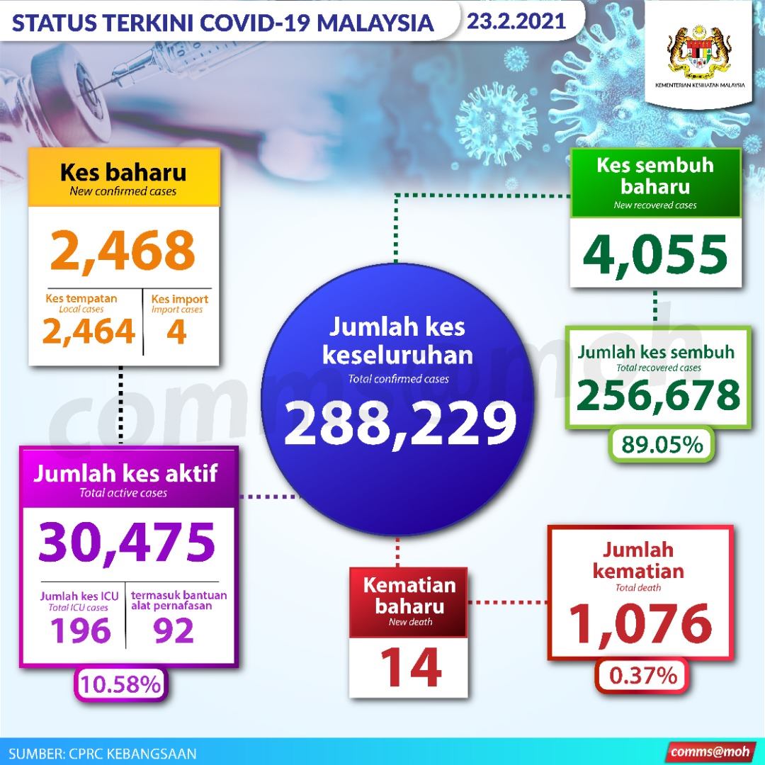 Sebanyak 2,468 kes COVID-19 baharu yang direkodkan di negara ini menjadikan jumlah keseluruhan adalah 288,229 kes, lapor AWANI