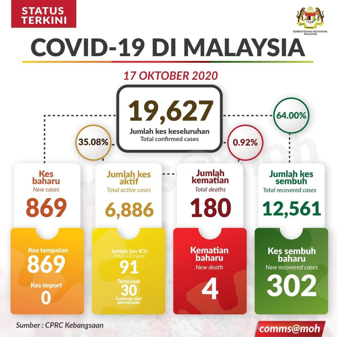 Berdasarkan laporan Kementerian Kesihatan Malaysia (KKM), kes baharu pada Sabtu, 17 Oktober 2020 setakat pukul 12 tengahari mencatatkan jumlah sebanyak 869 dan kesemuanya melibatkan kes tempatan.