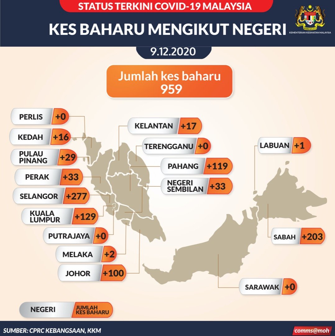 Daripada jumlah itu, Selangor menjadi negeri dengan kes harian paling tinggi sebanyak 277 kes diikuti Sabah (203) dan Kuala Lumpur (129).