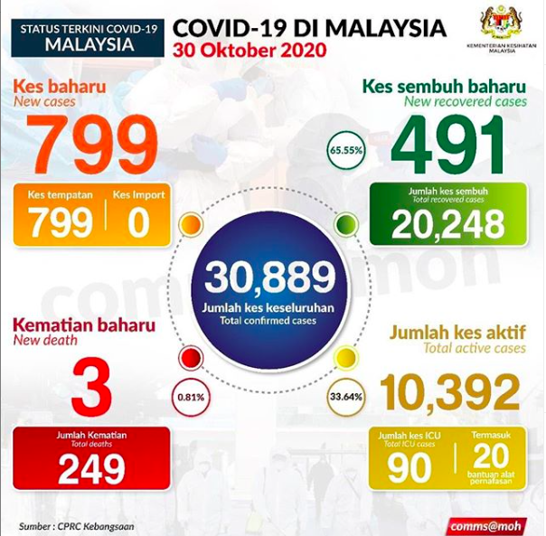 Kes baharu COVID-19 di Malaysia mencatatkan pertambahan kes sebanyak 799 kes baharu pada Jumaat, 30 Oktober 2020.