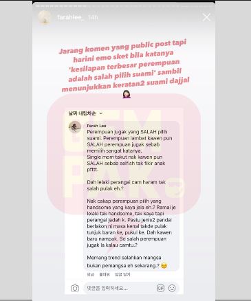 Komen berbentuk luahan itu kemudian dikongsikan Farah di Instagram Story miliknya.