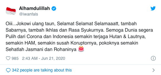 "Oiii... Jokowi ulang tahun, selamat selamat selamat, tambah sabarnya, tambah ikhlas dan rasa syukurnya," tulis Iwan melalui sebuah cuitan di Twitter.