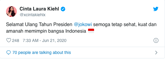 Biar tak biasa merayakan ultah, Jokowi tetap banjir doa. Si cantik Cinta Laura juga ikut menyampaikan doa di Twitter. "Selamat Ulang Tahun Presiden Jokowi semoga tetap sehat, kuat, dan amanah memimpin bangsa Indonesia," cuitnya.