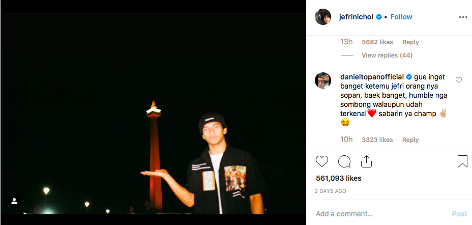 Pemilik akun @danieltopanofficial's malah menuliskan kalimat berbunyi: "Gue inget banget ketemu jefri orang nya sopan, baek banget, humble nga sombong walaupun udah terkenal. Sabar ya champ."