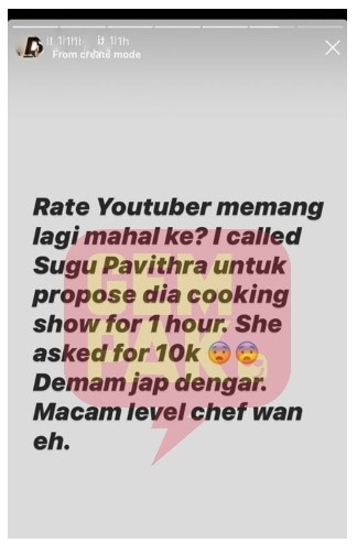 Perkara itu diluahkannya menerusi satu entri di Instagram Story miliknya yang menyifatkan bayaran itu setanding dengan bayaran cef selebriti, Datuk Redzuawan Ismail atau Chef Wan.