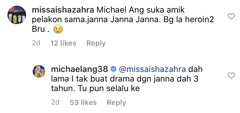 "Michael Ang suka ambil pelakon sama, Janna Janna Janna. Bagilah heroin-heroin baru," tulis pengikut itu di ruang komen di Instagram (IG).