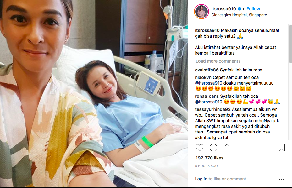 Dalam unggahan yang memperlihatkan seorang teman mengambil selfie bersamanya yang terbaring di ranjang dengan senyuman dan selang infus ditangannya, Rossa menyampaikan ucapan terima kasih buat semua doa yang telah dikirimkan kepadanya.