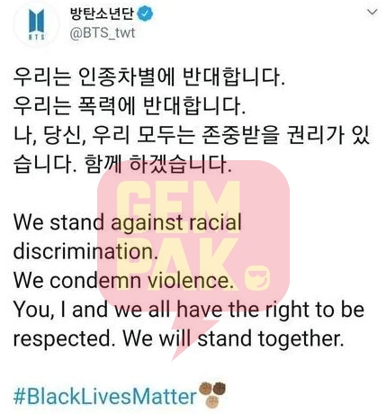 Tidak cepat melatah, BTS bagaimanapun tampil dengan menyatakan sokongan mereka terhadap gerakan Black Lives Matter melalui catatan di akaun Twitter rasmi mereka awal minggu ini.