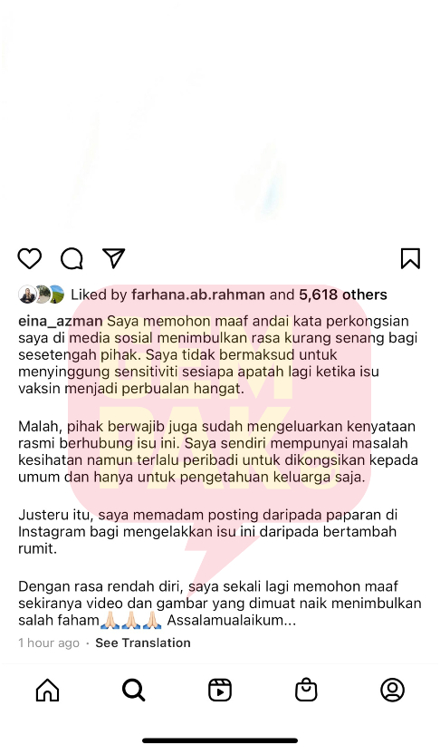 Pelakon dan selebriti Datin Paduka Eina Azman tampil membuat permohonan maaf selepas memuat naik foto ketika mendapatkan suntikan vaksin menjadi tular.