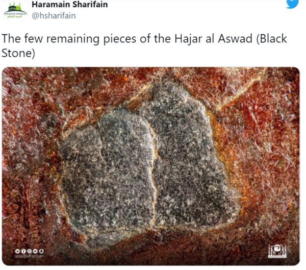 Batu Hajar Aswad dibingkai dengan perak di sudut tenggara Kaabah, bangunan berbentuk kubus yang dibangun oleh Nabi Ibrahim dan puteranya, Nabi Ismail.